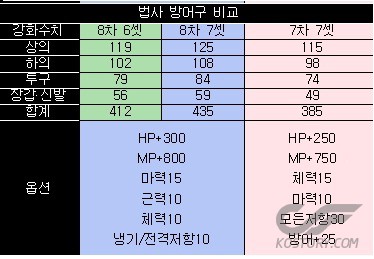 옵션만 보면 그렇지만 8차가 7차보다 요구스텟이 높기때문에 7차를 입게되면 남는스텟을 체력을 더올릴수가 있게되죠~ 결과적으로 피는 7차가 8차보다 더 많게됩니다7차셋이 피는 쪼끔 더높습니다. 별차이없구요